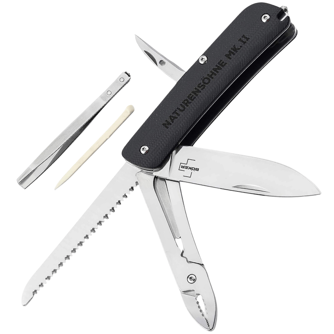 Gerrit și Andy apreciază numeroasele funcții pe care le combină cuțitul de buzunar multifuncțional compact Boker Plus Naturensöhne MK. II.