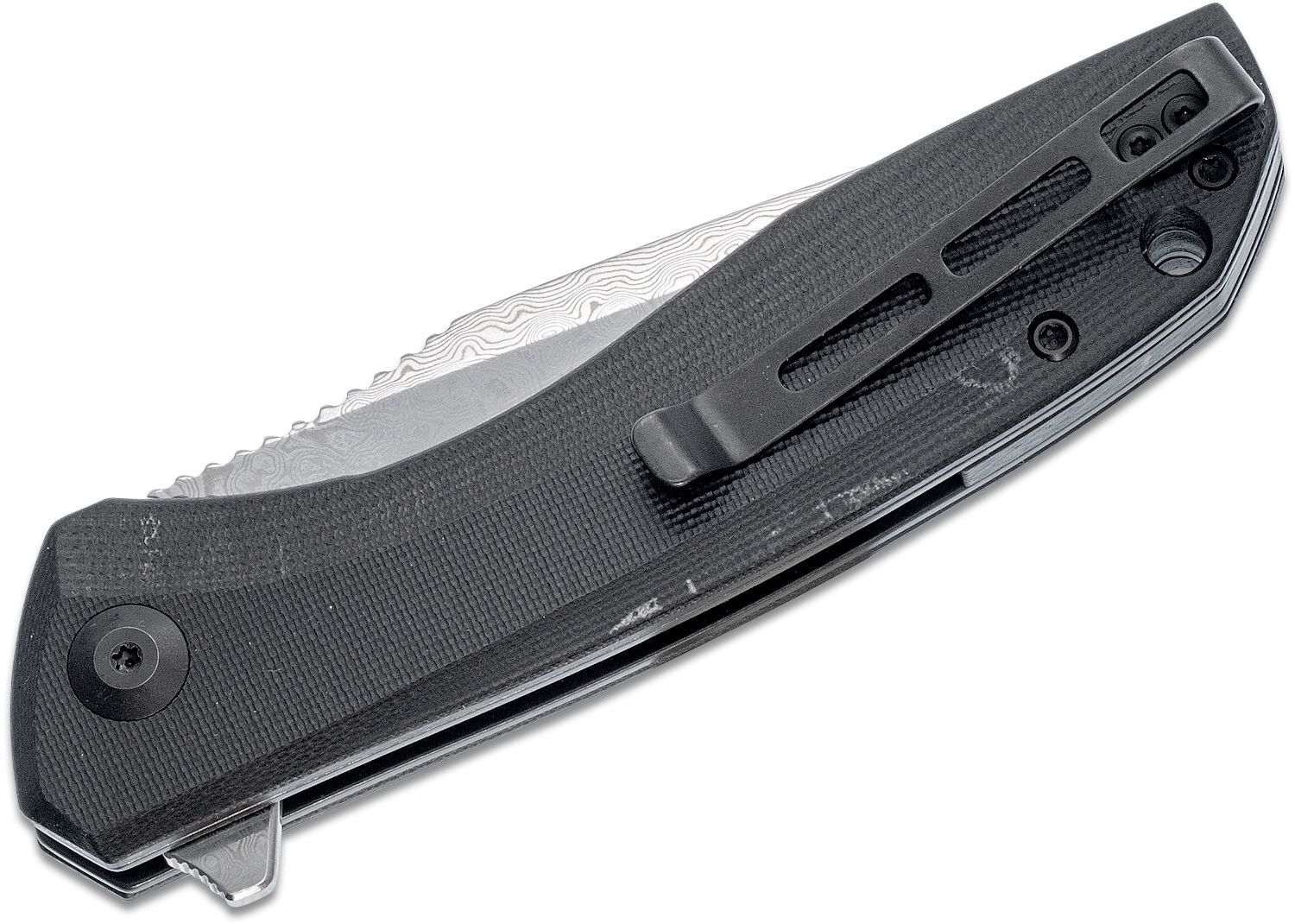 CIVIVI Backlash - lama din otel Damasc. (58-60HRC) Cuțitul se deschide simplu și ușor cu o singură mână folosind Flipperul. Liner Lock fixează cuțitul deschis. Mânerul este din material G 10, de culoare neagră. Cuțitul are un orificiu pentru șnur și o clemă cu două poziții pentru transportul într-un buzunar. Îl puteți muta pe cealaltă parte a mânerului, după cum este necesar.