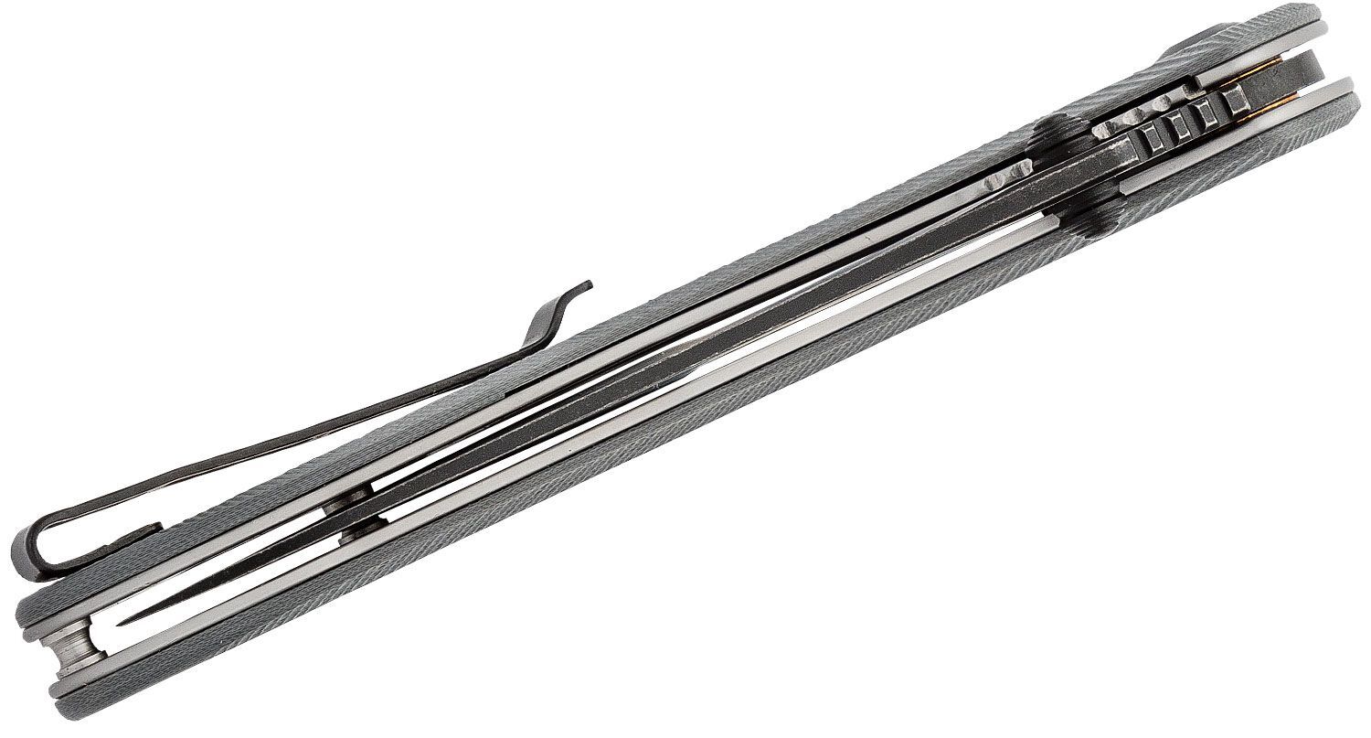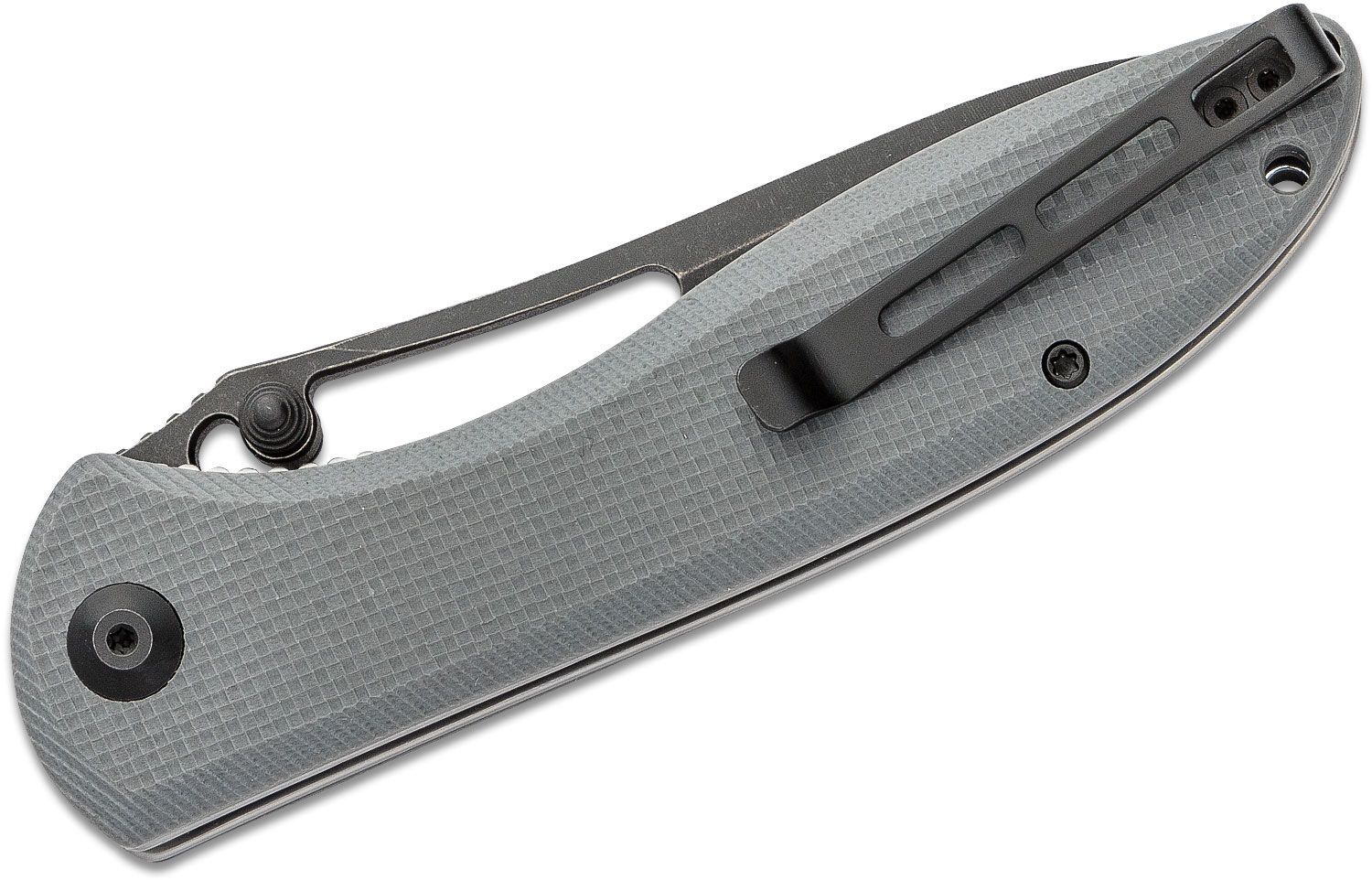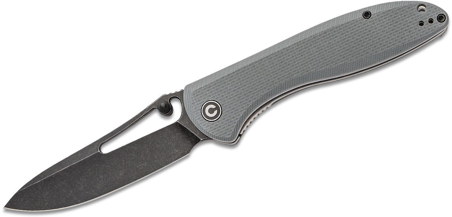 CIVIVI Picaro - Lama are un finisaj Black Stonewash. Este fabricat din oțel D2 cu o duritate de 59-61HRC. Se deschide cu o mână, cu un thumb stud pe lamă. Lama deschisă este asigurată de Liner Lock. Mânerul este din material G 10, de culoare gri. Este întărită cu plăcuțe de oțel. Are un orificiu pentru folosirea unei sfori. Clema pentru pantaloni este neagră și are două poziții, așa că o puteți muta pe cealaltă parte a mânerului, după cum este necesar. Permite o purtare decentă și neostentativă.