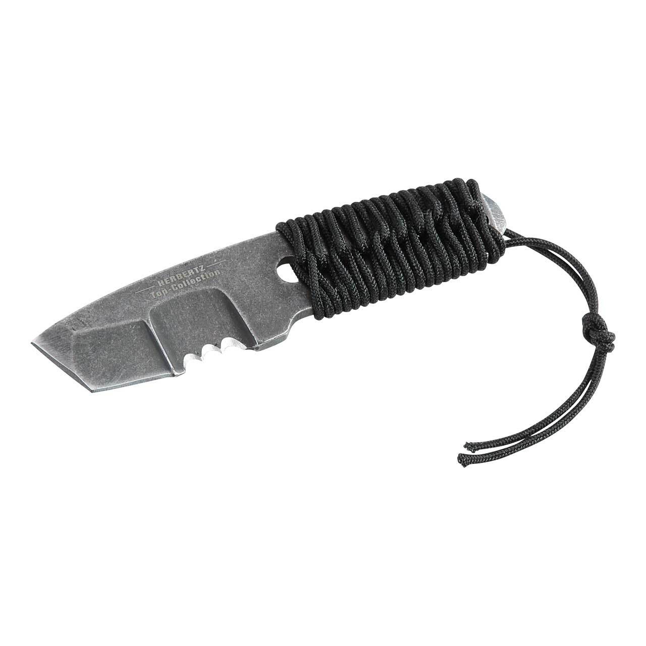 Cuțitul mic pentru gât Herbertz Top-Collection 521806 este potrivit, de asemenea, pentru supraviețuire sau luptă, cuțit integral metalic cu o lamă parțial din șa, realizată din oțel inoxidabil 440 cu un finisaj de la Stonewash. Mânerul este învelit în paracord negru. Cu o gaură pentru sfoară. Vine cu o carcasă Kydex și o curea pentru gât.