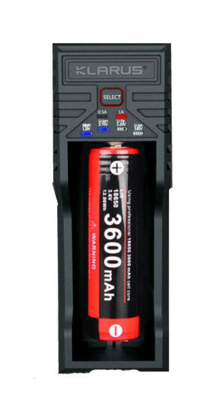 Încărcător USB Klarus K1 pentru o baterie. Acesta a îmbunătățit încărcarea - curentul de încărcare reglabil la 500 mAh sau 1000 mAh (automat se încarcă la 500, poate fi schimbat la 1000 cu butonul SELECT). Funcție specială ZERO VOLTAGE (dacă tensiunea scade sub 3 V). Fabricat din plastic ABS. Are un indicator color LED a stării de încărcare. Utilizează un port micro USB - se poate utiliza și un cablu USB de la un telefon mobil.