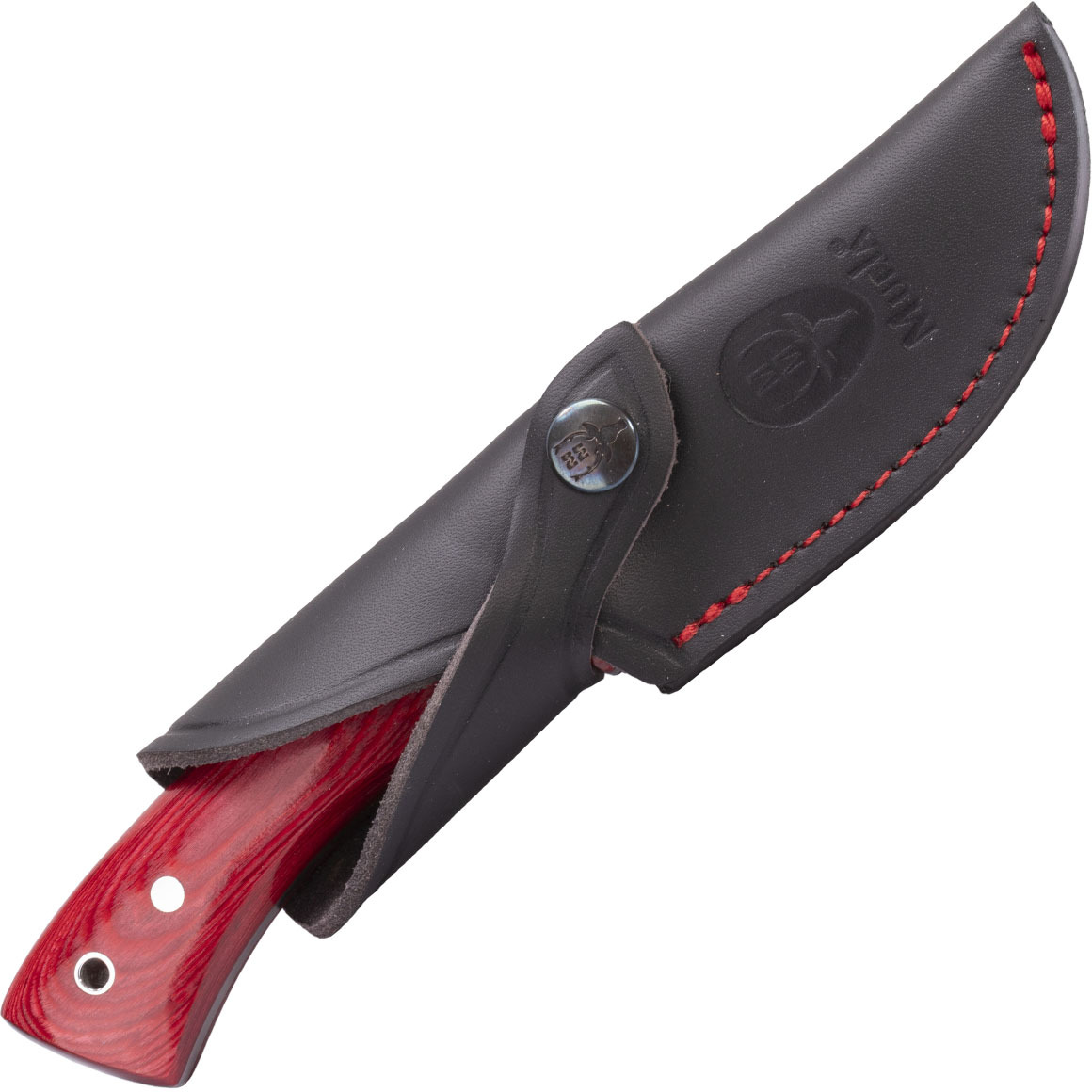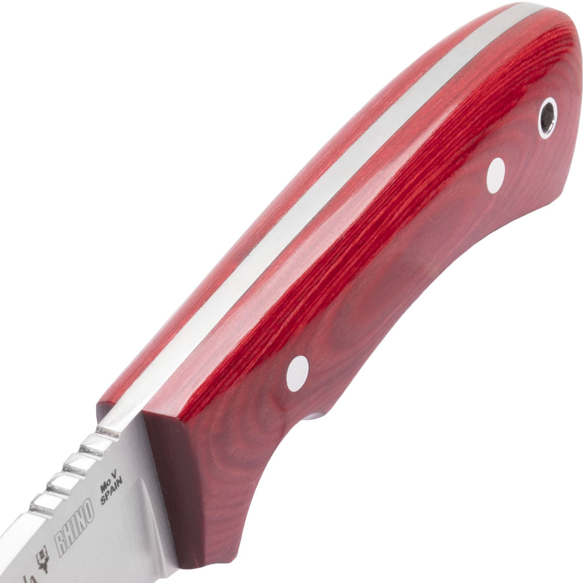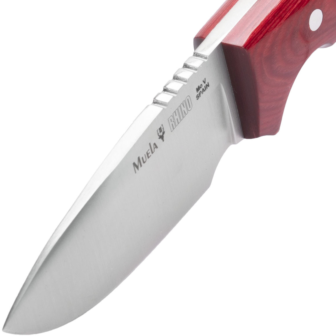 Muela RHINO-9R este un mic cuțit durabil Muela RHINO-9.R este utilizat pentru activități în aer liber. Lama este realizată dintr-o bucată de oțel X50CrMoV15 și are crestături mușcate pe spate. Mânerul este din lemn tare Pakka în roșu și are o gaură pentru o sfoară la capăt. Vine cu o carcasă din piele.