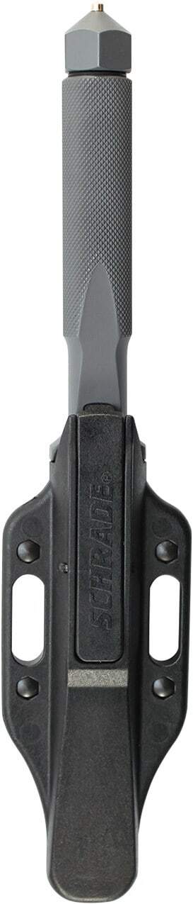 Cuțit tactic de luptă Schrade, cu o lamă în formă de pumnal, cu o suprafață mată și o margine netedă din oțel carbon 1070. Mânerul este din metal, cu o suprafață ruginită și are un întreruptor de sticlă la capăt. Vine cu o carcasă din plastic.