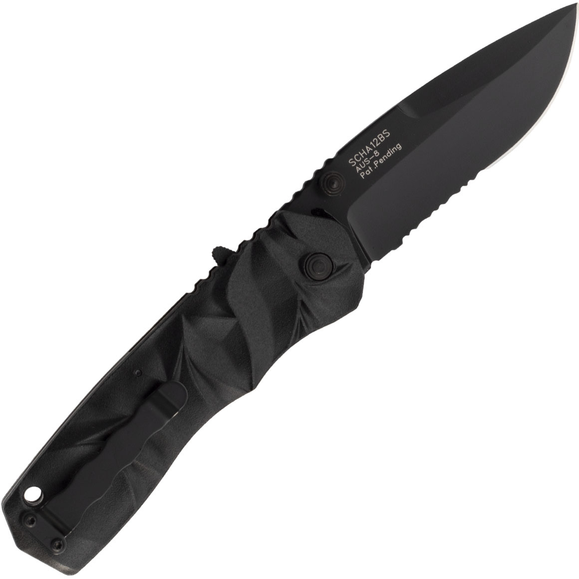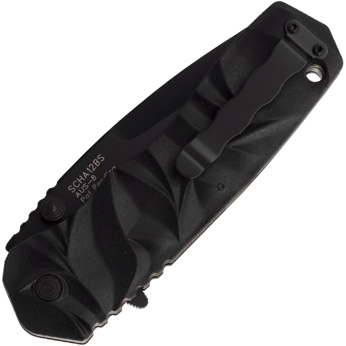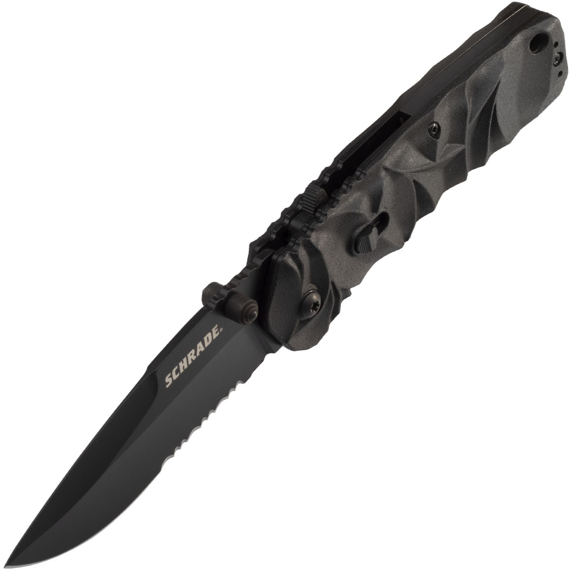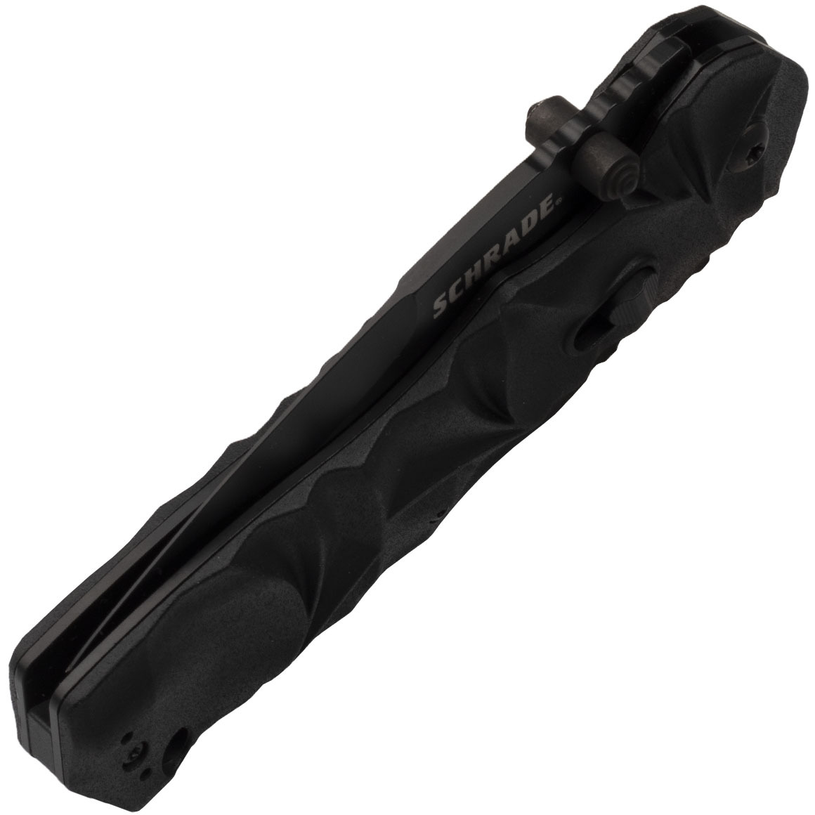 Cuțitul tactic de închidere a buzunarului cu deschidere dublă Schrade Black Dual Action are o lamă parțial neagră, din oțel japonez AUS-8. Poate fi deschis cu ajutorul unui arc, flipper sau pins, fixat de o siguranță Linerlock. Mânerul este confecționat din aluminiu negru cu o gaură pentru o sfoară și o clemă pentru curea.