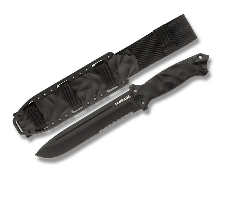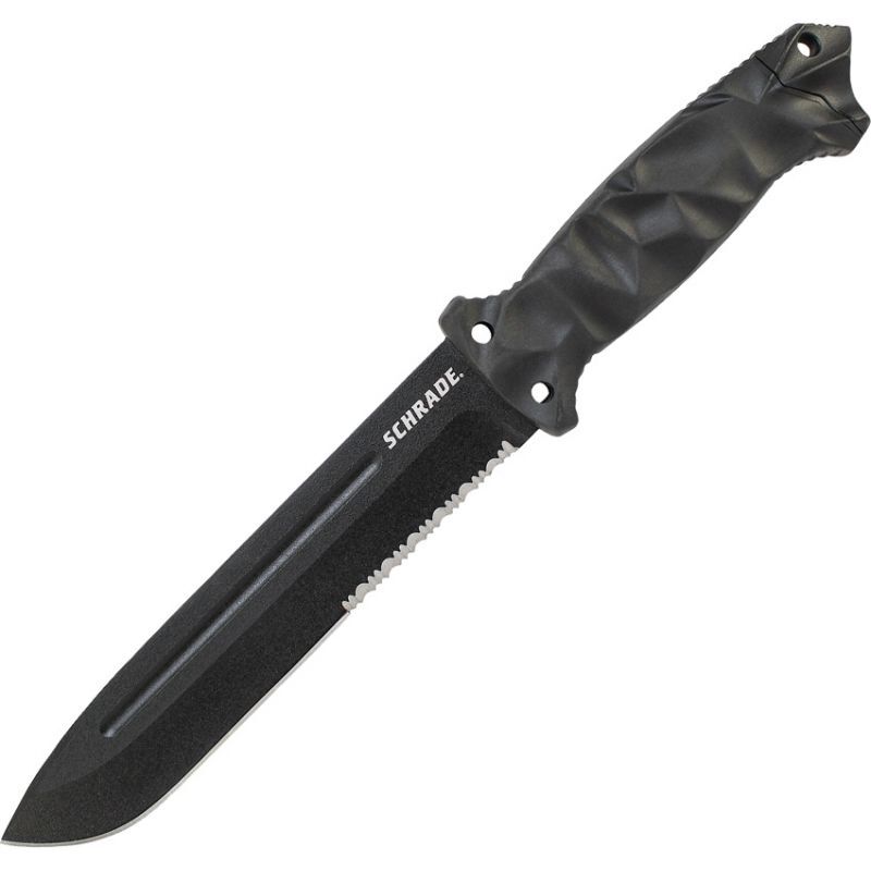 Cuțitul mare tactic Schrade are o lamă lungă cu o dințare parțială cu o suprafață neagră din oțel Sk 5 și un mâner din cauciuc și GFN cu un capăt metalic pentru ruperea sticlei. Vine cu o carcasă din nylon.