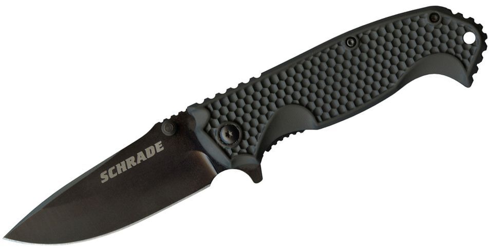 Cuțit pliabil ușor pentru utilizarea de zi cu zi Schrade cu lamă de oțel netedă netedă 8Cr13MoV cu blocare Linerlock și deschidere cu știfturi laterale. Mânerul este confecționat din plastic negru cu tratament antiderapant și o gaură pentru sfoară. Cu catarama centurii.