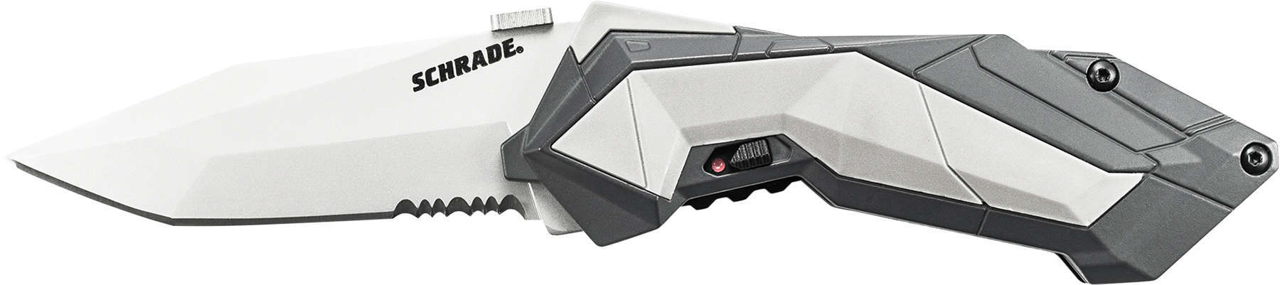 Cuțit pop-up cu deschidere asistată Schrade MAGIC, cu lamă Tanto albă parțial dantelată din oțel 4034 și mâner din aluminiu gri-alb. Cu catarama centurii. Este fixat de o siguranță Linerlock.