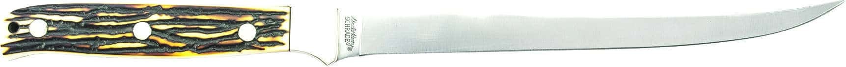 Filet de cap de oțel Schrade cu lamă lungă și îngustă pentru lucrări fine din oțel carbon 7Cr17MoV. Are un mâner din plastic staglon cu suporturi de nichel. Vine cu o carcasă din piele.