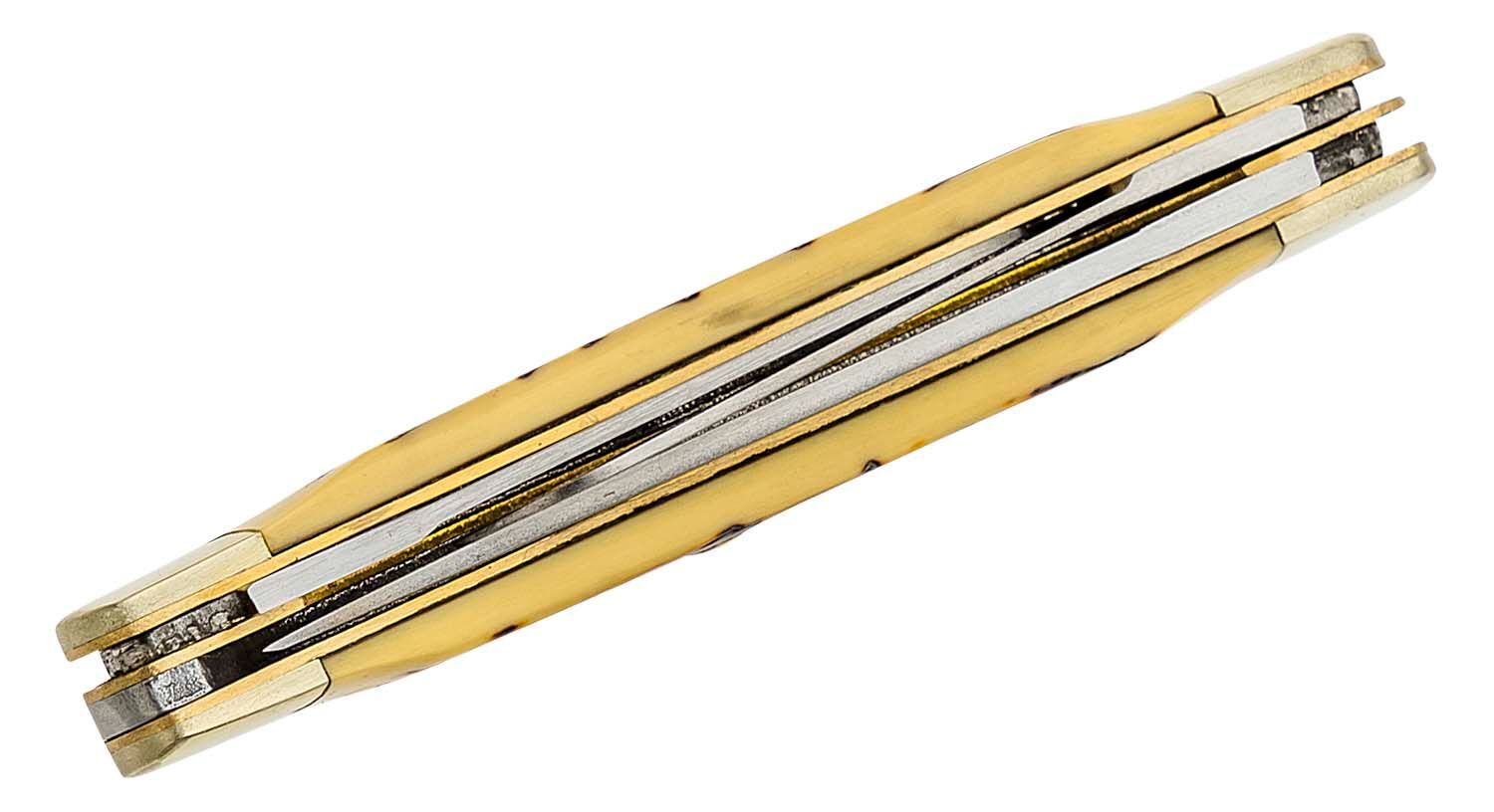Cuțitul uncle Henry cuțit cu trei lame. Lamele sunt asigurate cu ajutorul siguranței Slipjoint. Mânerul este din alamă și imitatie de coarne.