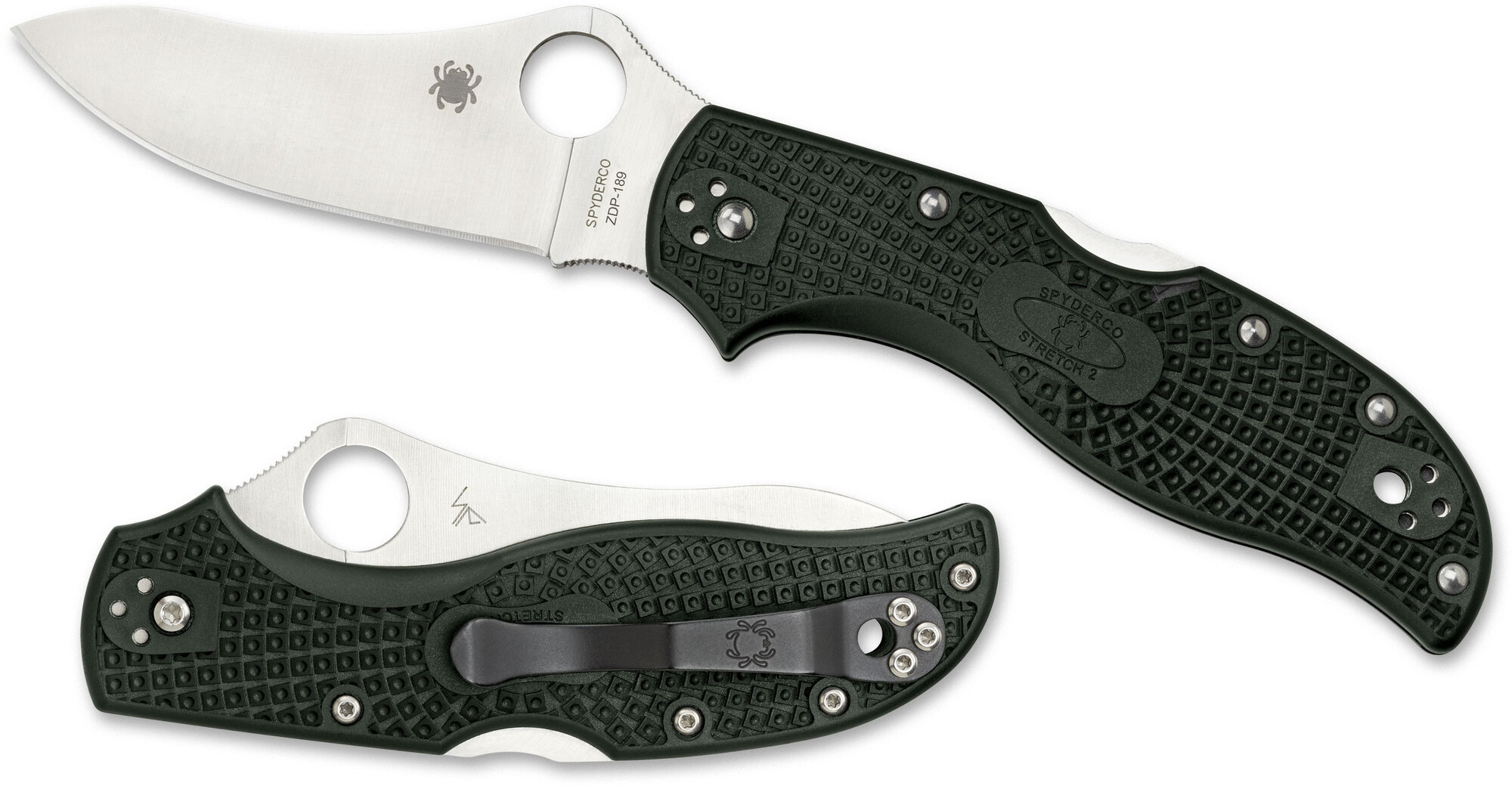 Stretch 2 se bazează pe modelul original Spyderco C03 Hunter. Bazat pe cunoștințe și idei ale vânătorilor care folosesc cuțitele Spyderco în câmp, Stretch 2 are un mâner mai lung adaptat pentru a crește efectul de pârghie, o mai bună ergonomie pentru a reduce oboseala pe parcursul utilizării pe termen lung și un repaus cu degetul mare pentru o muncă de câmp mai sigură. Lama imbunatatita este un teren plat si este din otel inoxidabil ZDP-189. Se deschide cu o gaură rotundă pe lamă cu o mână. Un cuțit deschis asigură în mod sigur blocarea din spate. Mânerul este confecționat din material verde FRN. Clipul de buzunar este în patru poziții, ceea ce înseamnă că îl puteți muta în funcție de necesități. Mânerul are o gaură pentru sfoară.
