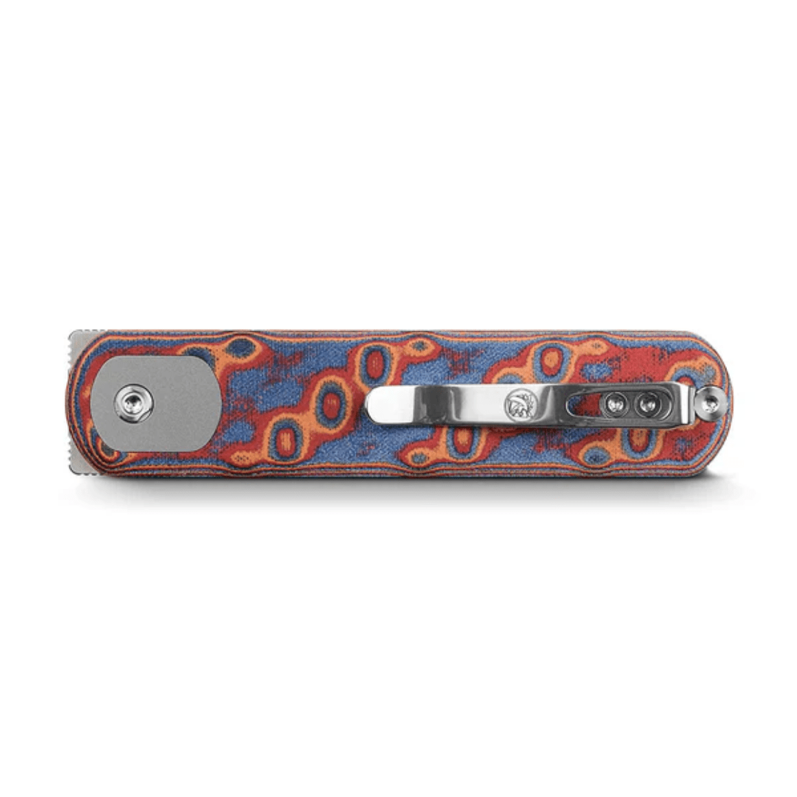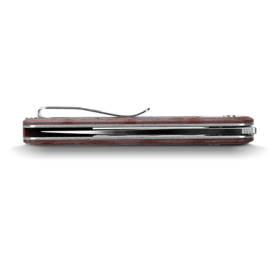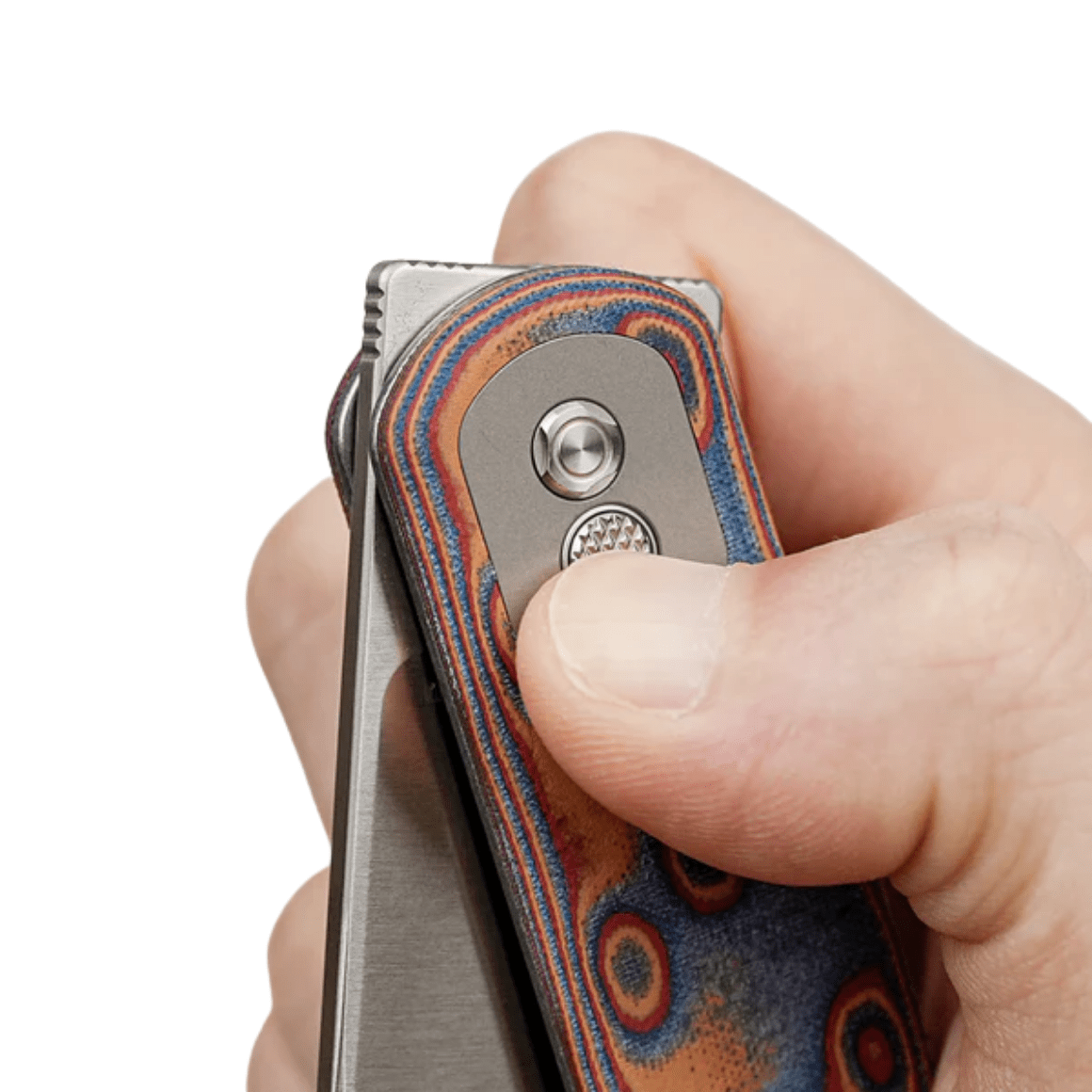 Mânerul Corgi folosește un design simetric, asemănător unei oglinzi. Cu un unghi de rotație de 180 de grade, lama va dispărea magic din mâner. Realizat din Raindrop Micarta din cupru pentru o priză confortabilă.
