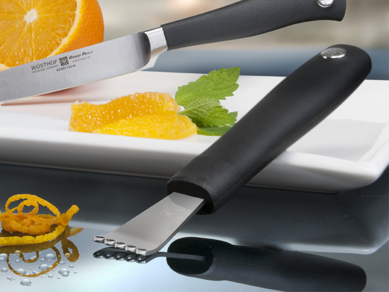 Decojitor Wüsthof Silverpoint pentru coaja de citrice și, de asemenea, pentru crearea de benzi de legume. Fabricat din oțel inoxidabil și atinge până la jumătate din mânerul sintetic negru.